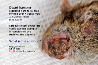 The hamster has good appetite but he is irritated by this scab, rubbing his left eye till it swells and is shut most of the time. The owner is very worried as the left eye becomes swollen and closed. She consulted Toa Payoh Vets. Is there a solution?